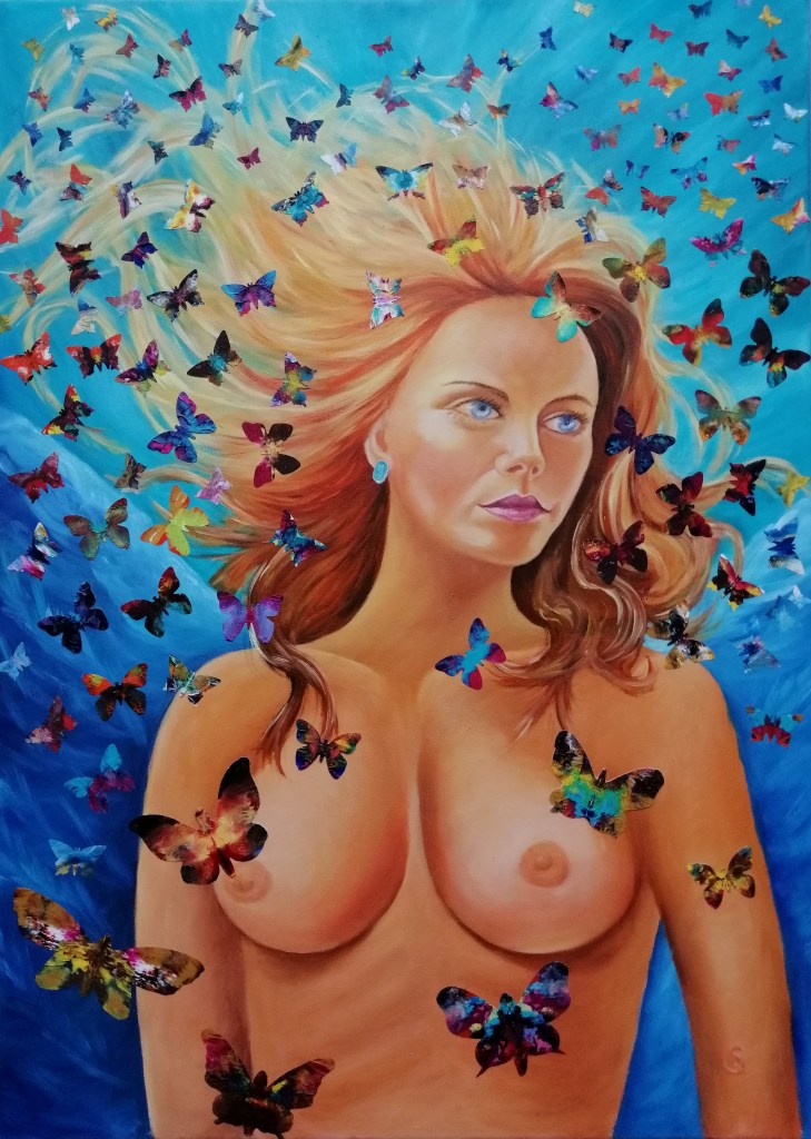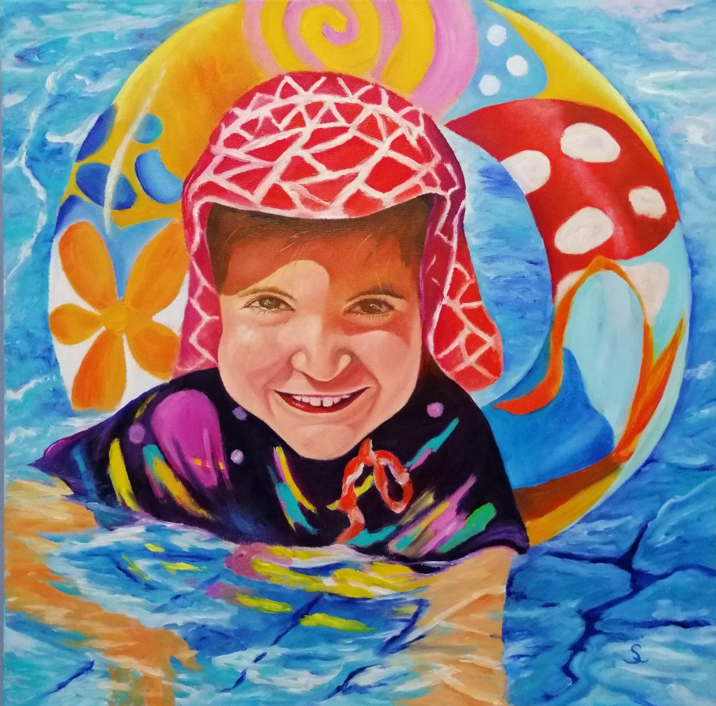 She works with acrylics, oils and watercolors and developed an abstract art form “ART in ART”. Her art focuses on her love and the beauty of nature, characters, children but also world events such as climate change, pollution of the oceans and much more.