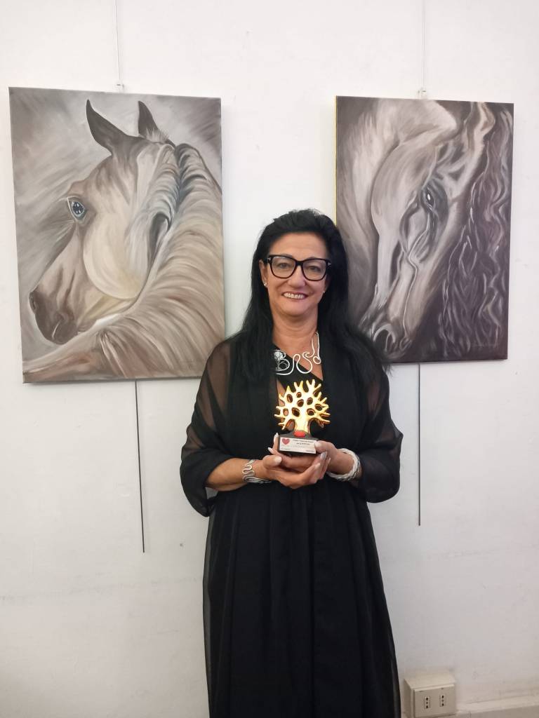 I am Marcella Bianciardi, born in Porto Santo Stefano, on 04/11/1959. I have always had a passion for drawing and tailoring, and I dedicated myself to work and family for a long time. At the age of 55, I decided to go back to studying my passion, painting, and at 60 I graduated; from that moment on I dedicated myself totally to painting: I took a year to paint what my heart asked for and made me feel good. I took cues from what made me emotional. With the work “COUPERIN”, I was selected and called for an international SNAI competition at the San Siro racecourse in Milan: I didn’t believe it and I was afraid, knowing that I would be competing with award-winning painters; but I was encouraged and it all started from there. The ART AND HORSE Trophy) was no longer a dream, it became a reality. Since then I have participated in biennials, competitions, exhibitions, fairs and received several prizes, but in my thinking I have always remained myself, without letting it go to my head. I have participated in awareness-raising and donation exhibitions, such as the Butterfly and the Pink Together, by virtue of which one of my paintings is now permanently exhibited on a wall of the mammogram department. I will continue along this path because painting is important to me, it makes me feel good physically and mentally. Colors are a sign of life, like the rainbow that shines after a storm: that’s how I am, after a painting I use my colors to illuminate my life, and that of those who love my art.