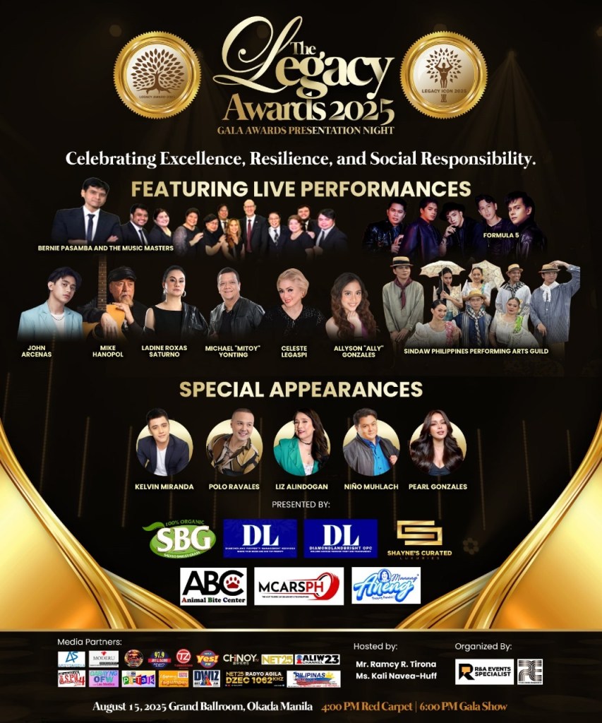 Manila, Philippines — On August 15, 2025, the Grand Ballroom of Okada Manila will shine brighter than ever as The Legacy Awards 2025 Gala Presentation Night gathers the nation’s most esteemed icons, trailblazers, and visionaries for an evening destined to be etched in history. The evening begins with the Red Carpet Affair at 4:00 PM, where elegance and prestige take center stage, followed by the Gala Show at 5:00 PM — a spectacular tribute to Filipino brilliance, culture, and enduring legacies. An extraordinary roster of performers will captivate the audience: Allyson “Ally” Gonzales, Bernie Pasamba and The Music Masters, Celeste Legaspi, Formula 5, John Arcenas, Ladine Roxas Saturno, Michael “Mitoy” Yonting, Mike Hanopol, and the Sindaw Philippines Performing Arts Guild. The glamour intensifies with appearances by celebrated stars Celeste Legaspi, Kelvin Miranda, Liz Alindogan, Niño Muhlach, Pearl Gonzales, and Polo Ravales, whose artistry continues to inspire generations. The night’s masters of ceremony, Kali Navea-Huff and Ramcy R. Tirona, will guide guests through an unforgettable journey of recognition and entertainment. Presented by DiamondLand Property Management Services, DiamondLandBright OPC, Dr. Pau ABC Animal Bite Center, MCar PH, MCR Realty Ventures OPC, Manang Aneng Foods Corporation, Municipality of Taytay, Palawan, Salveo Barley Grass, and Shayne’s Curated Luxuries, and supported by an exceptional network of media partners, this event is a grand testament to unity, pride, and Filipino excellence. Produced by PESMS Events Management and R&A Events Specialist, The Legacy Awards 2025 is more than a celebration — it is a living tribute to the spirit, resilience, and creativity of the Filipino people, inspiring today and shaping tomorrow. #LegacyAwards2025 | #LegacyIcons2025 | #BePartOfTheLegacy
