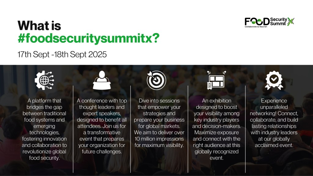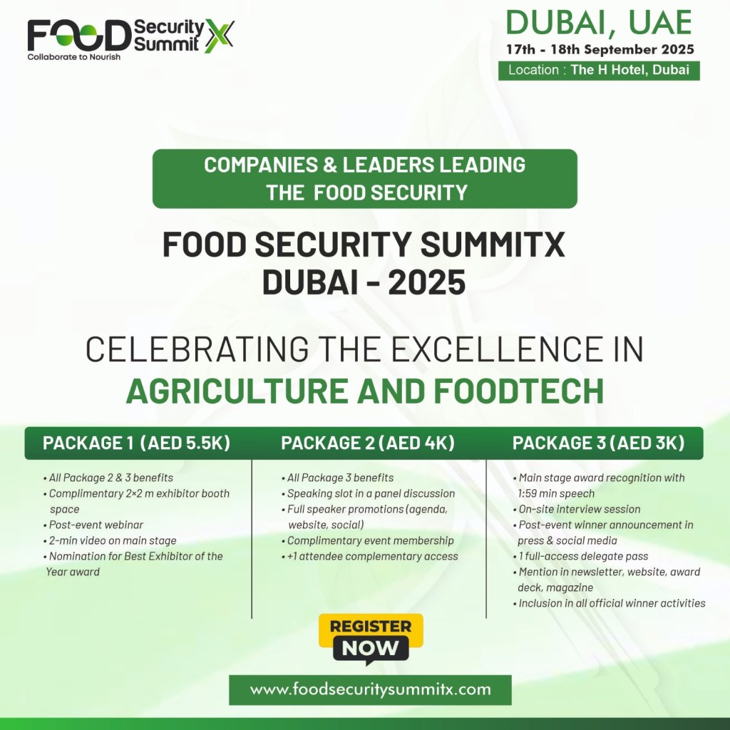 SummitX will also feature a remarkable lineup of speakers, including Dr. Sadar Abdul Rasheed (Climate Risk Expert), H.E. Dr. Obaid Saif Hamad Al Zaabi (Chairman, Arab Authority for Agricultural Investment), Valeria Kogan, PhD (CEO, Fermata), Dr. Mohammed AlBreiki (Director of Applied Research and Capability at ADAFSA) and Tristan Fischer (CEO, Fischer Farms Ltd), alongside many more distinguished professionals shaping the future of food security. Opportunities for engagement include sponsorships, exhibitions, media partnerships, speaker applications, and award nominations, offering participants access to unparalleled networking, investments, and visibility. Food Security SummitX 2025 is more than an event—it is a movement to inspire collective responsibility and drive global action for a sustainable, hunger-free future. Register today: foodsecuritysummitx.com